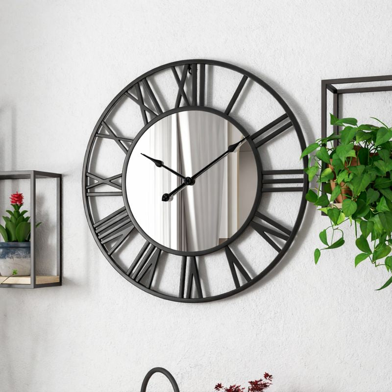 Large Black Wall Clock with Mirror, 24" Silent Roman Clock, Heavy Metal, Living Room Wall Decor