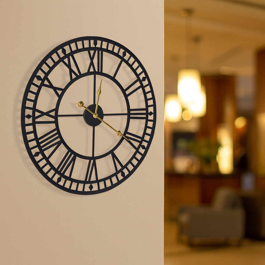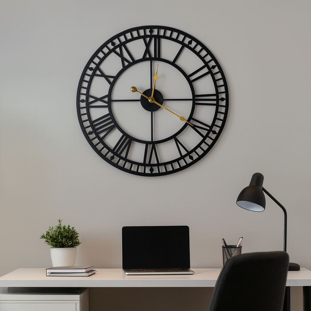 Enhance your home with the timeless elegance of the Oversized Round Metal Wall Clock. Measuring an impressive 32 inches, this statement piece features a sleek black metal frame with bold Roman numerals, adding a touch of vintage charm and modern sophistication to any room. Designed with silent, non-ticking quartz movement, it ensures a peaceful atmosphere while keeping accurate time. Perfect for living rooms, kitchens, offices, or entryways, this clock blends seamlessly with industrial, farmhouse, and contemporary decor styles.