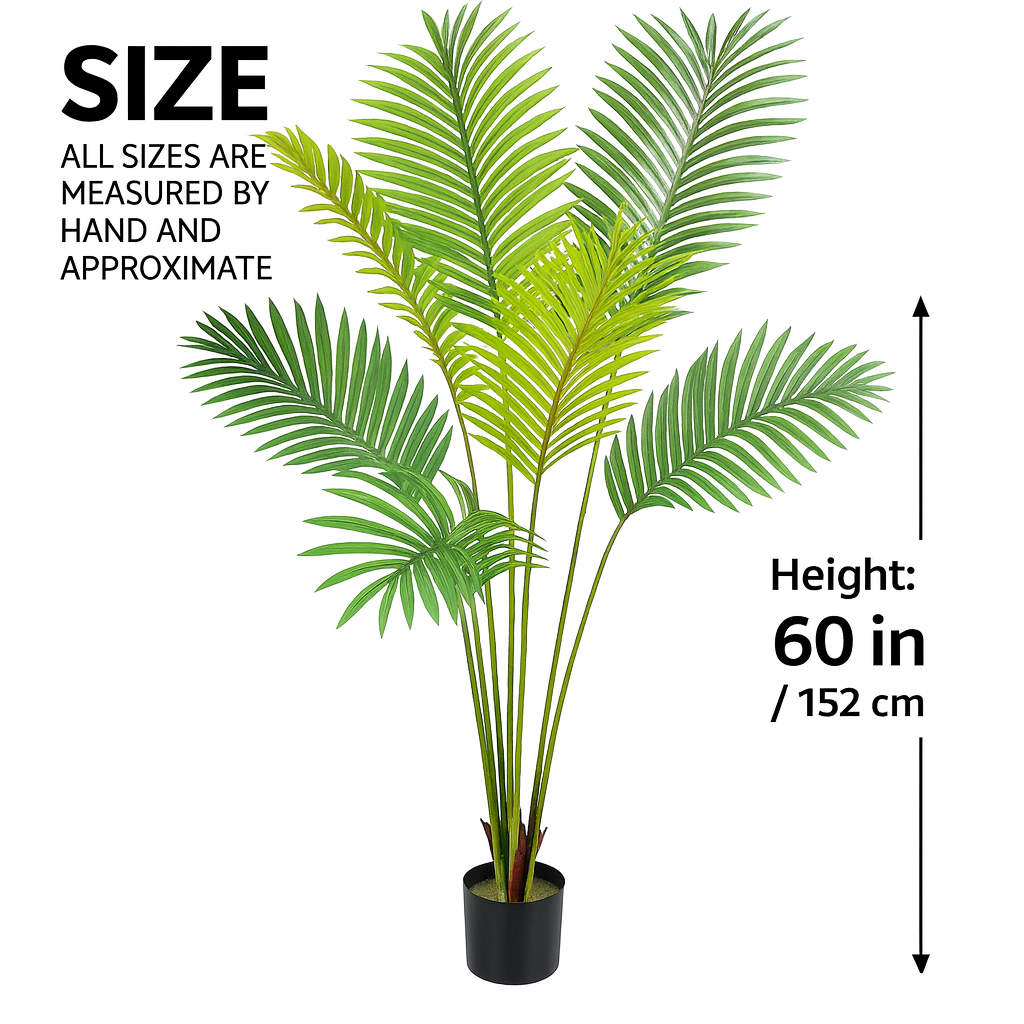 This stunning 5 ft Artificial Areca Palm Tree is designed to bring the beauty of realistic foliage indoors with a nearly natural look and touch. Featuring lifelike leaves and stems, this faux plant is evergreen but with little to no maintenance. The black sturdy base ensures a stable foundation, making it a perfect decorative accent for your home, office, patio, or porch. This artificial areca palm offers a fresh green vibe all year round without any upkeep. NOTE: Spray with UV-resistant spray if placed outdoors to protect the fake plant from extreme heat.