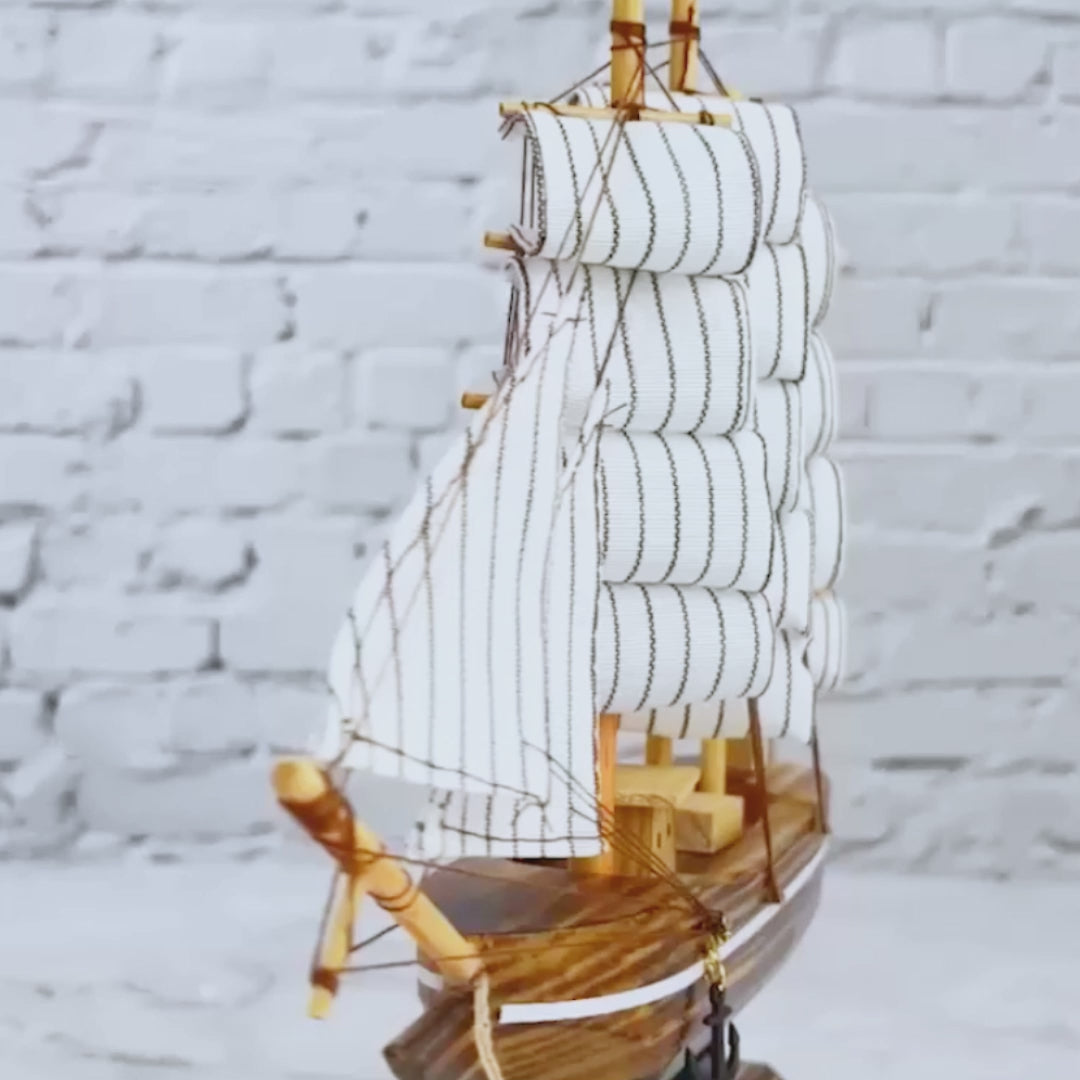 Brown Wooden Sailboat Model With Realistic Cloth Sails - Nautical Marine-Inspired Home Decor