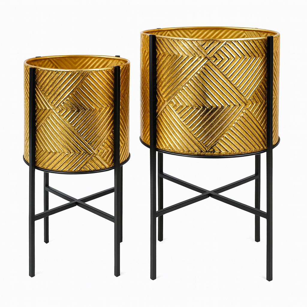 Rustic Golden Planters, Textured Foil Surface, Metal Plant Pots Pair with Black Stand, Unique Indoor Decor Gifts