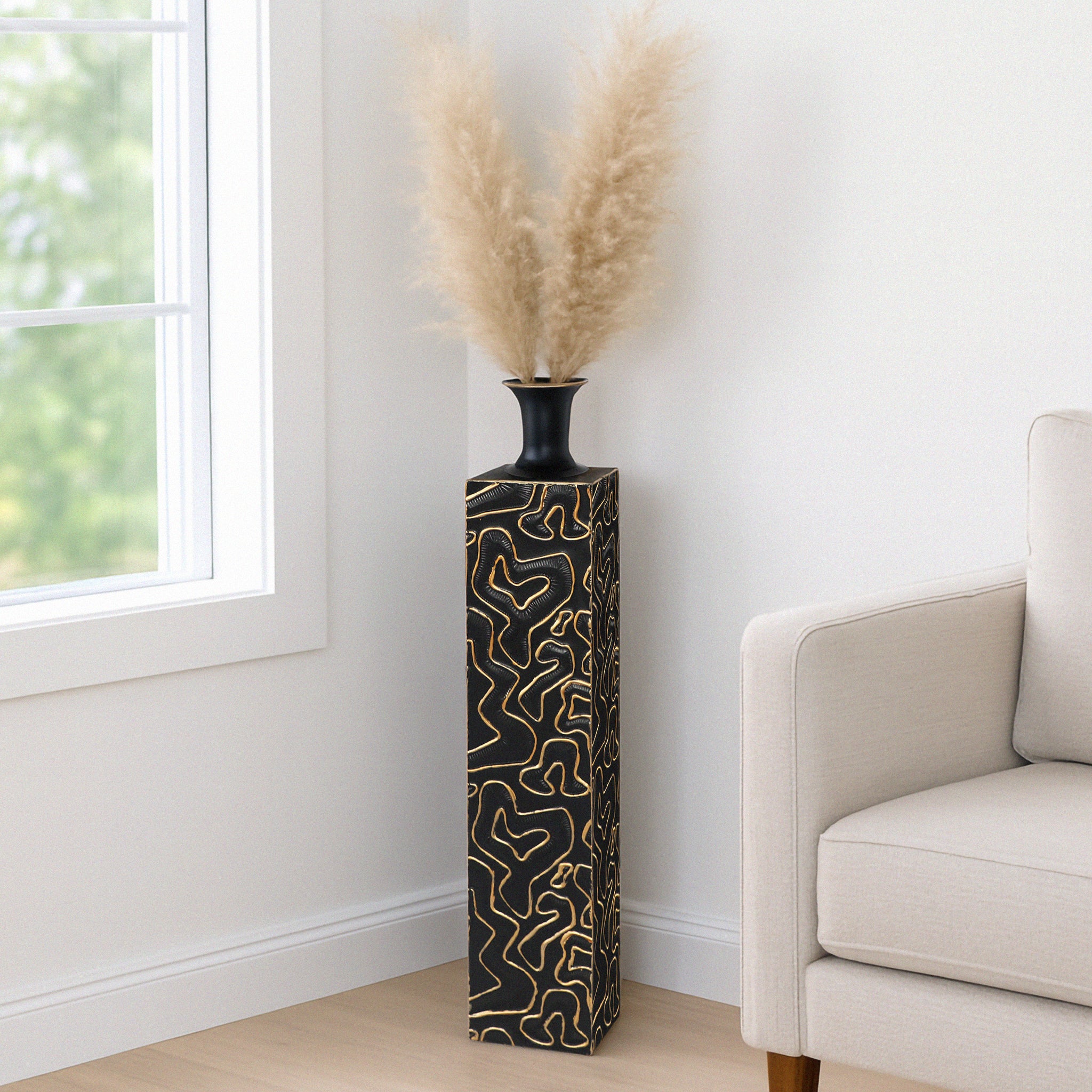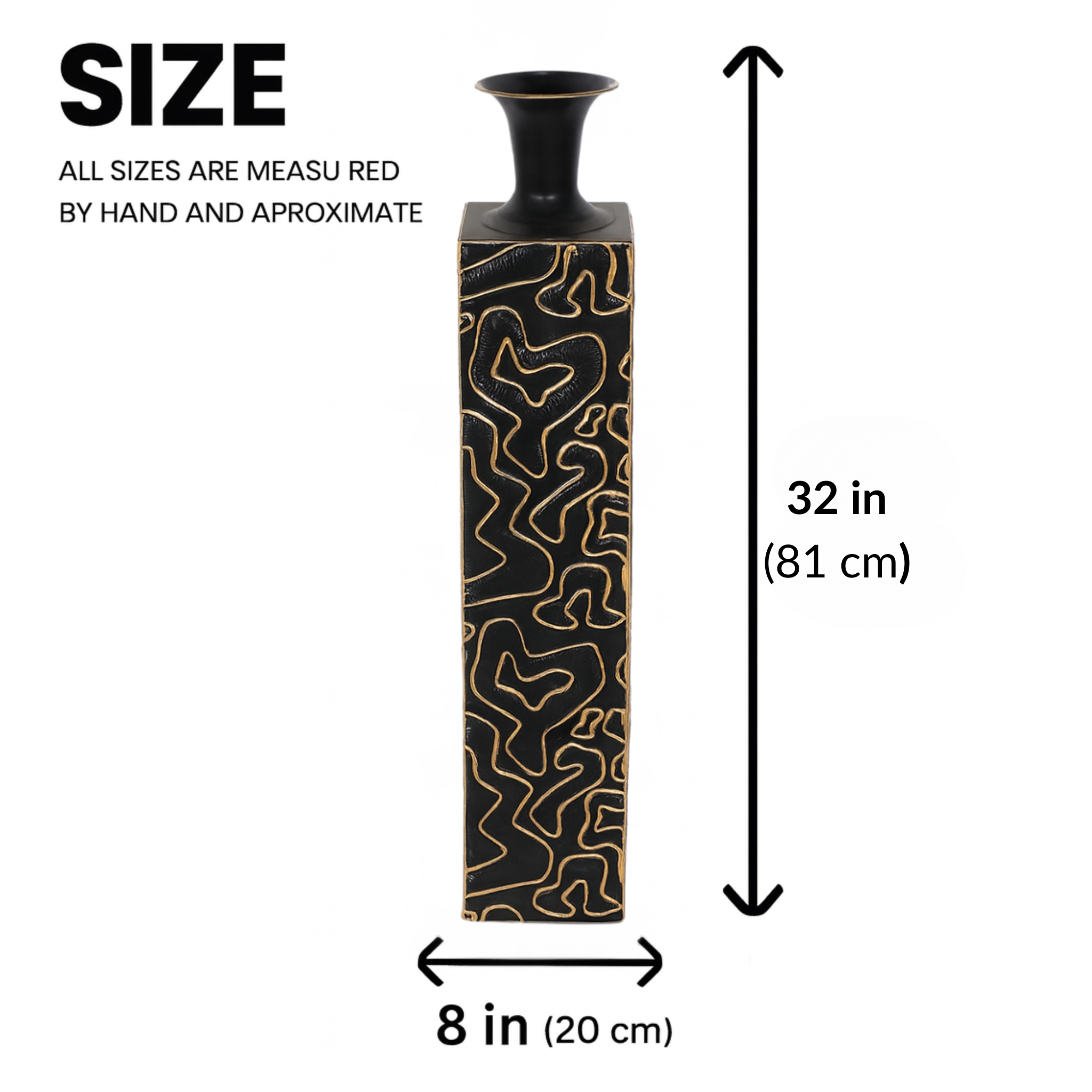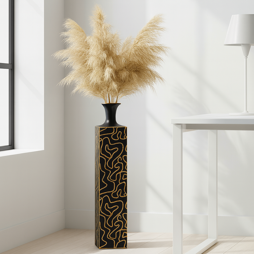 Enhance your space with the elegant Decorative Tall Metal Floor Vase. Standing 32" tall, this handcrafted black vase features striking gold accents and a modern square shape, perfect for adding a touch of sophistication to any room. Ideal for displaying pampas grass, dried flowers, or decorative sticks, this statement piece brings a stylish, contemporary flair to your home décor. Perfect for living rooms, entryways, or any indoor space.
