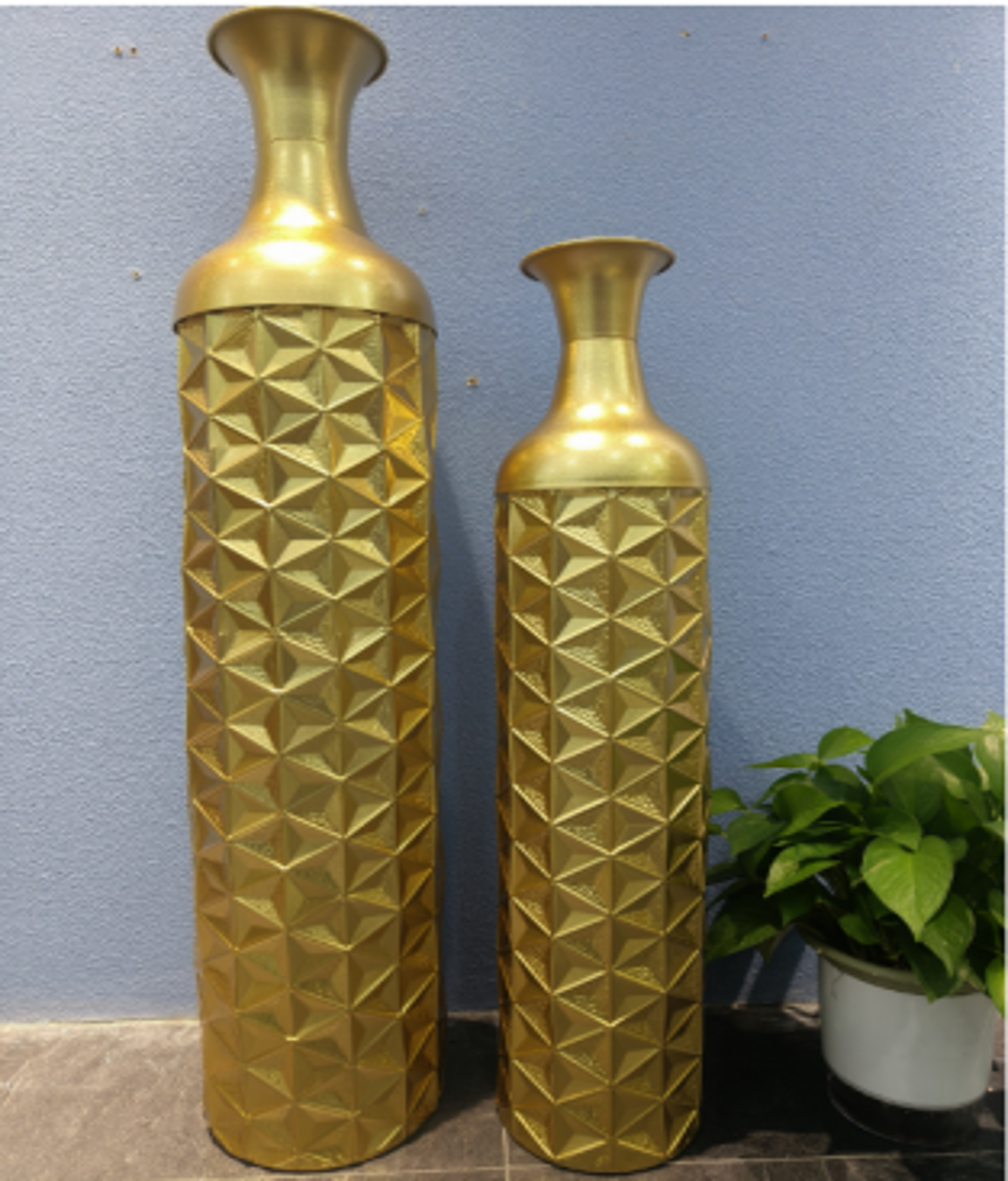 Looking for that perfect "wow" factor to complete your space? Instantly elevate your home with this stunning Set of 2 Tall Gold Floor Vases. Designed to make a statement, these vases aren't just accessories; they're the finishing touch that ties your room together. This set includes two impressive sizes (98cm and 80cm) that look beautiful grouped together to create a high-impact display, or separated to bring a cohesive, luxurious touch to different corners of a room. The staggered heights create visual interest that draws the eye. The design features a gorgeous, tactile geometric pattern on the body, which catches the light and adds a layer of sophisticated texture. This is beautifully contrasted with a smooth, brushed gold neck for a timeless look. Perfect for flanking a fireplace, styling a bare entryway, or adding a touch of glamour to your living room corner, these metal vases are a designer's favorite. Fill them with tall botanicals like pampas grass, dried branches, or faux florals to create a dramatic arrangement.